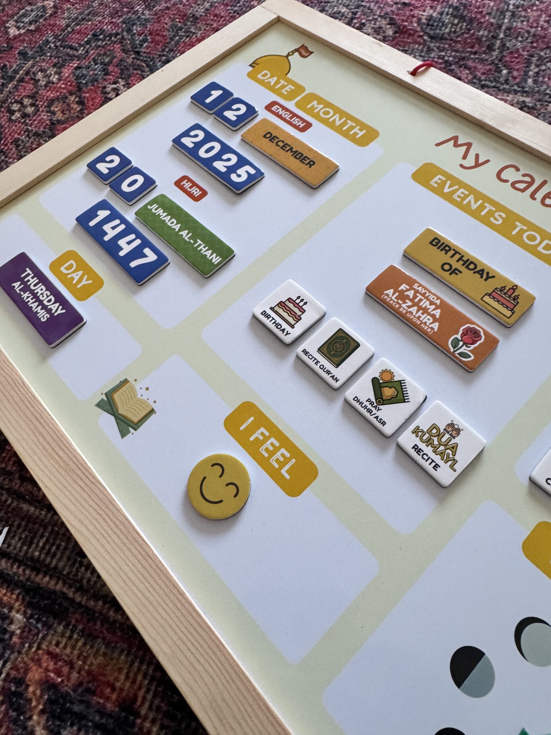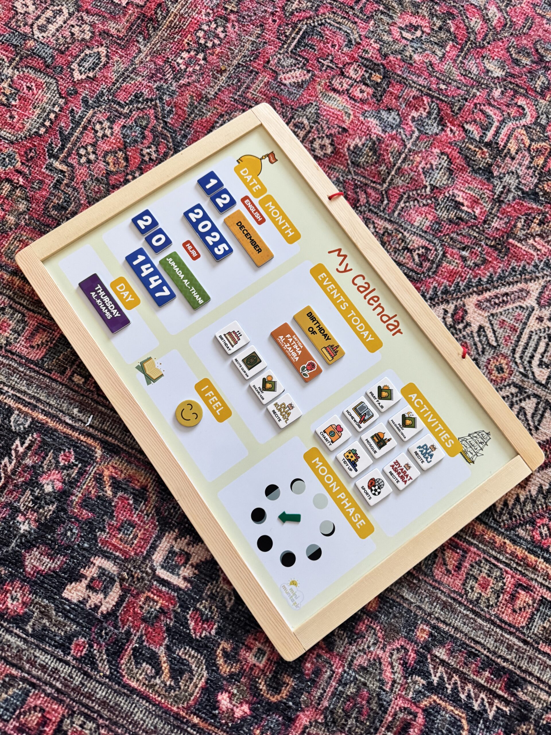 This bright, hands-on magnetic calendar is a wonderful way to keep little hands busy and curious minds ticking. Designed especially for children, it helps them explore Hijri and Gregorian dates, follow the moon’s journey, recognise important Shia occasions, and gently check in with how they are feeling each day.